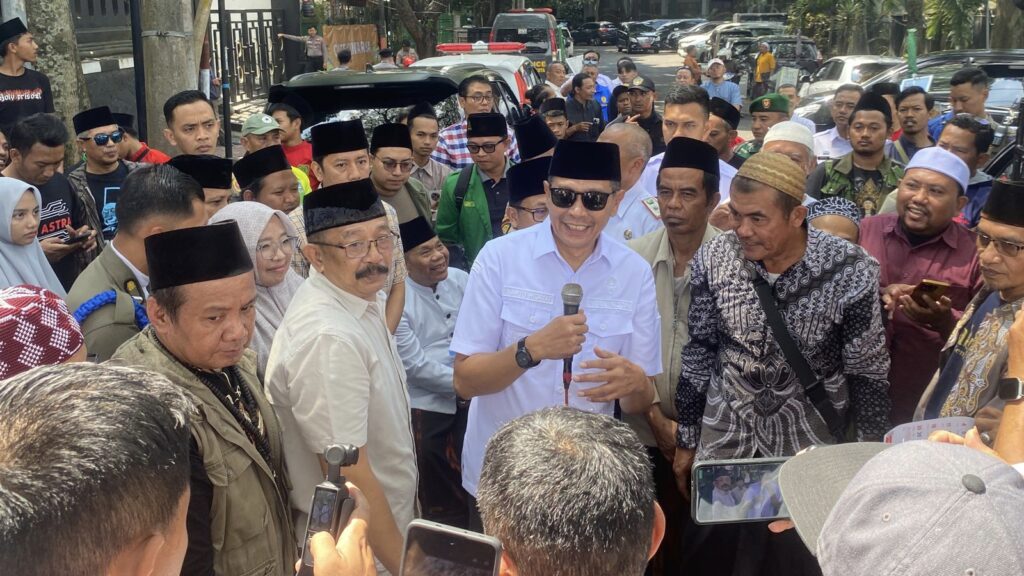 Wali Kota Malang, Wahyu Hidayat bersama sejumlah anggota DPRD Kota Malang menerima langsung massa aksi damai yang terdiri dari ratusan santri di depan Balai Kota Malang, Rabu (15/10/2025).