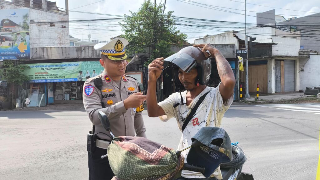 Jajaran Satlantas Polresta Malang Kota membagikan sekitar 100 helm gratis kepada pengendara roda dua di beberapa titik strategis Kota Malang, pada Jumat (21/11/2025).