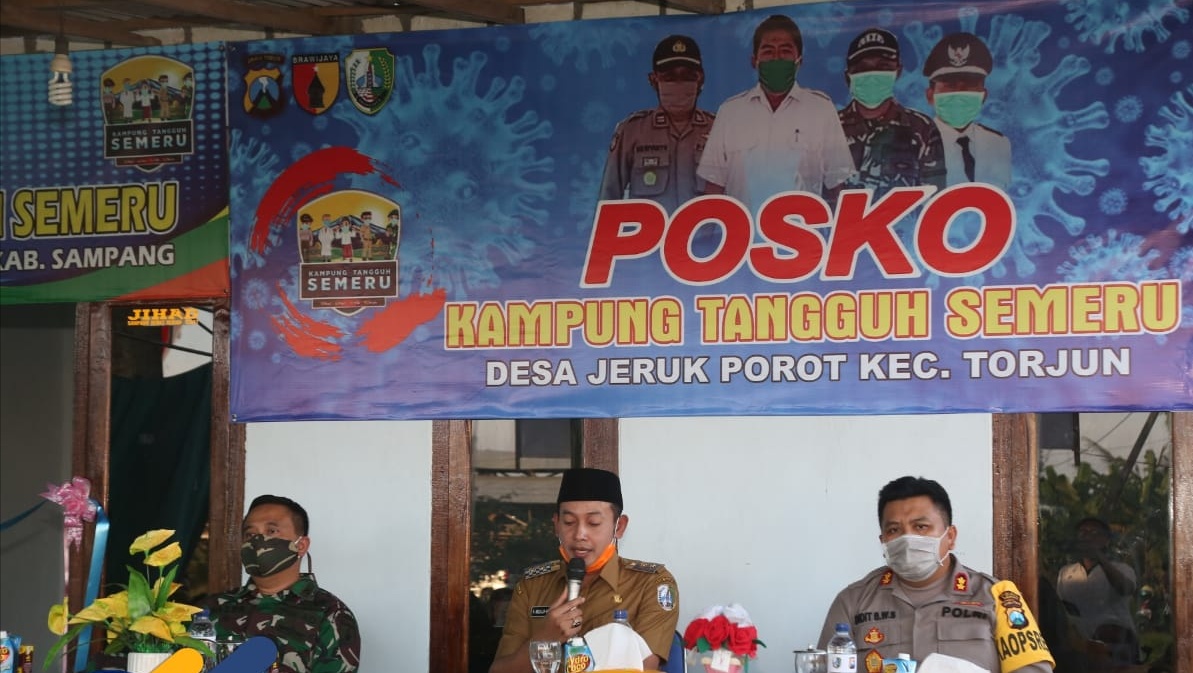 SAMPANG, Malangpagi.com – Wakil Bupati Sampang H.Abdullah Hidayat didampingi Forum Koordinasi Pimpinan Daerah (Forkopimda) Sampang meresmikan kampung tangguh di Desa Jeruk Porot, Kecamatan Torjun, Kabupaten Sampang, Senin 8/6/2020.