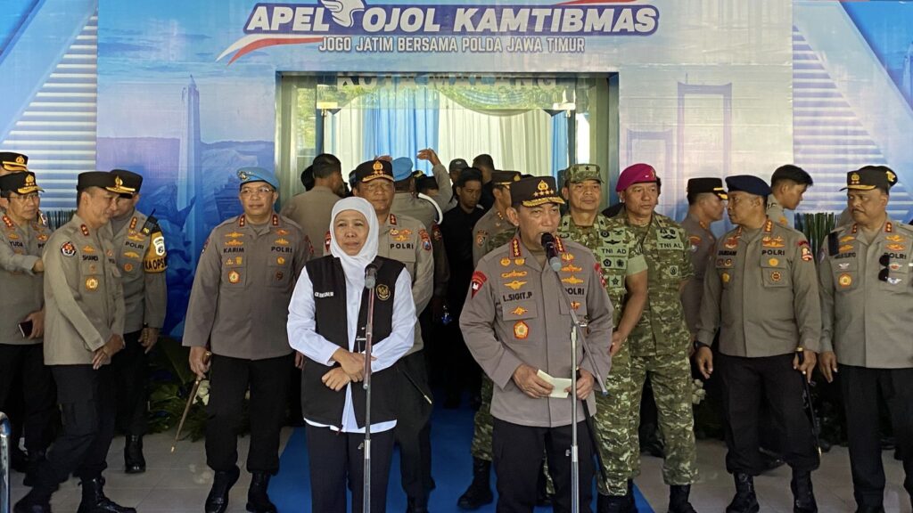 “Alhamdulillah, kita baru saja melaksanakan kegiatan apel ojol kamtibmas dengan tema Jogo Jatim bersama ojol dan Polda Jatim. Saya mengucapkan terima kasih kepada seluruh komunitas ojol yang hari ini ikut apel sekaligus menyampaikan deklarasi ojol kamtibmas,” ujar Kapolri.